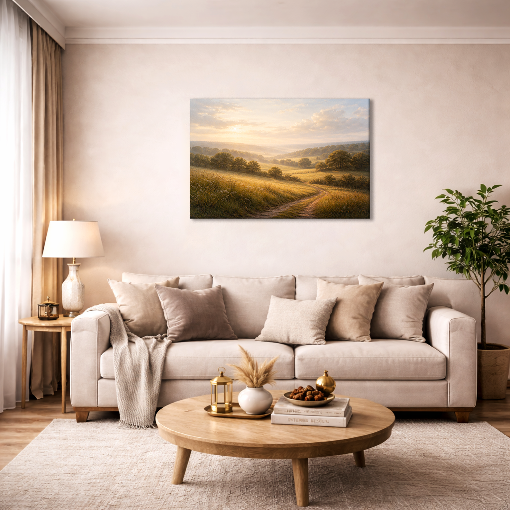 The gentle pathway leading through rolling fields creates depth and visual flow, making this canvas an ideal choice for living rooms, lounges, bedrooms, offices, and reading corners. Its balanced composition complements neutral and modern interiors while adding a natural focal point to your wall.