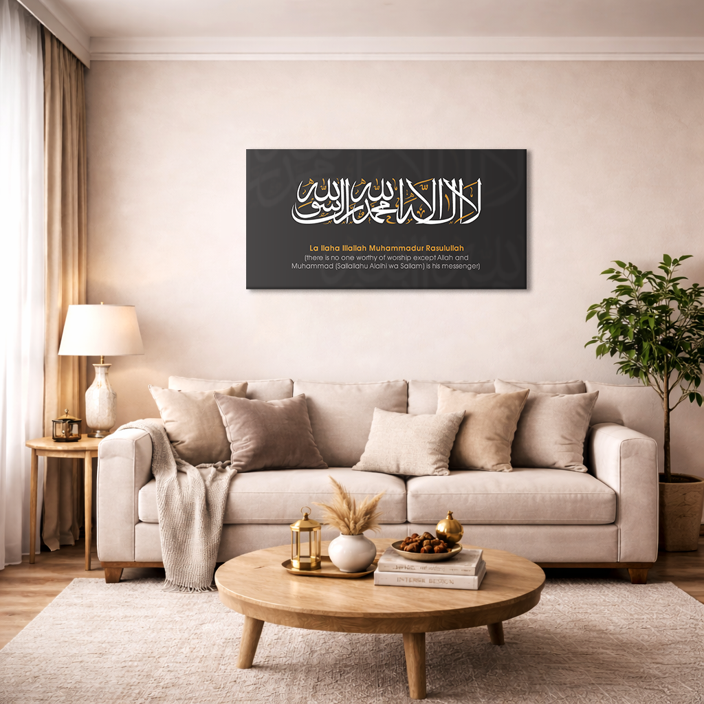 This elegant design complements various decor styles, from traditional to contemporary. Whether displayed in your living room, bedroom, or home office, the canvas serves as a daily reminder of faith and spiritual depth.Strengthen the spiritual presence of your space with the Kalma Shahada Premium Islamic Canvas Wall Art. This artwork beautifully displays the sacred declaration of faith — La Ilaha Illallah Muhammadur Rasulullah — in bold yet refined Arabic calligraphy, accompanied by a subtle English translation for deeper understanding and reflection.