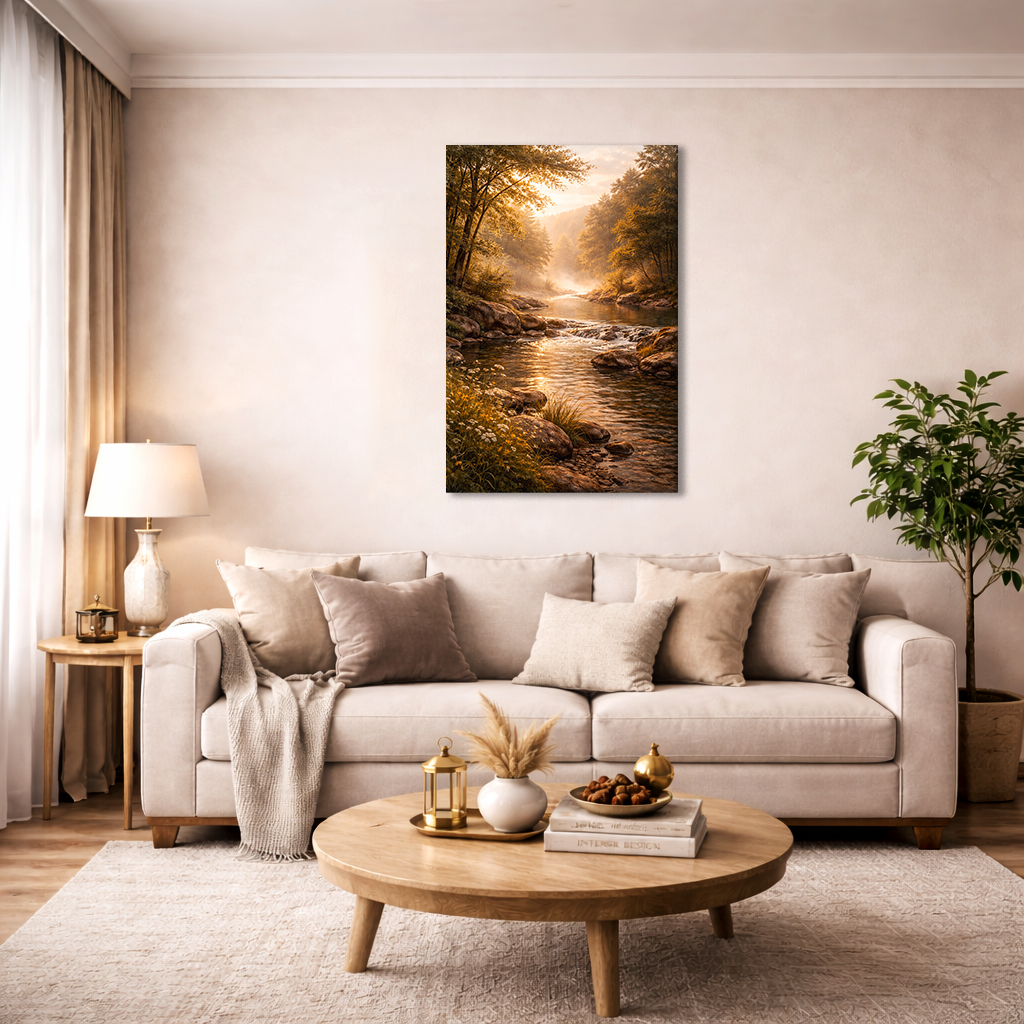 The Golden Autumn River Landscape Canvas isn’t just decor—it’s an escape. Ideal for living rooms, bedrooms, or even home offices, its rich hues of amber, gold, and rustic brown instill a sense of peace and mindfulness. Printed on high-quality materials, this piece not only elevates your interior design but also ensures long-lasting vibrancy and detail. Imagine the calm flow of a river bringing a touch of serenity to your everyday life.